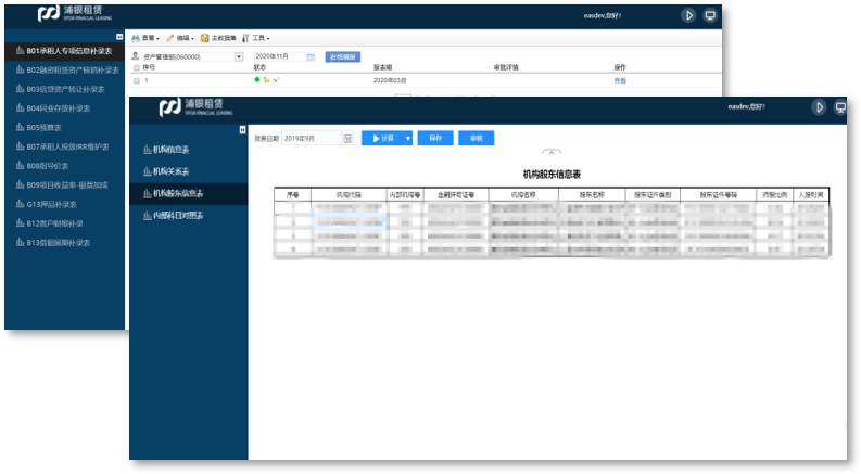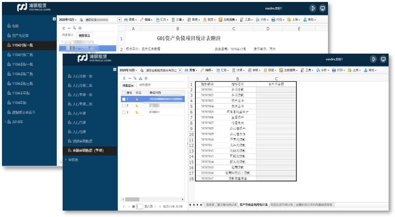 浦银租赁大数据服务平台一共建设了183张报表,涵盖日常工作报表、财务报表、监管报送、1104报表、人行报表、总行报表、EAST报表等,满足公司领导、资产部门、财务部等各部门人员多样化的数据分析需求。帮助高管快速掌握公司的运营情况,精细化管理;让业务人员自助拖拽报表,释放实施人员精力,为业务人员给予工作便利,提高工作效率;支持监管报表的填报、审核、上报、汇总等工作,满足监管报表的定时报送要求。