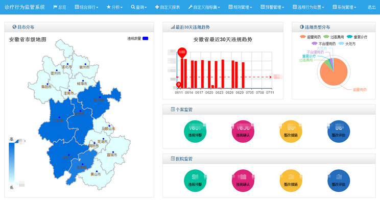 冠新诊疗行为平台采用独有的数据挖掘技术以及违规行为智能预警机制,监管医生及医院对患者进行的各种检查、诊断、用药、护理、康复等诊疗行为,防止医生及医院超范围用药、大检查、大处方等违规行为。