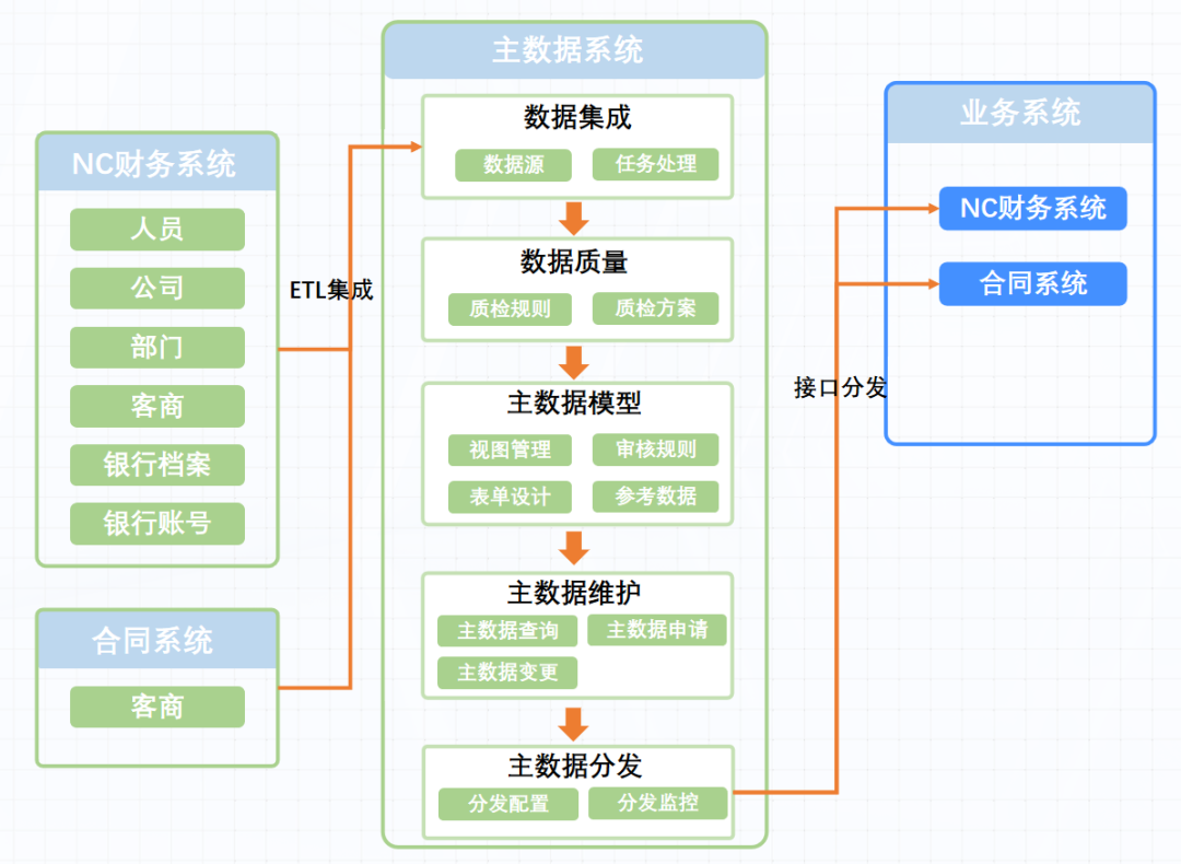 主数据管理系统(MDM)为主要目标,实现集团本部合同管理系统、人力资源系统、OA、门户系统、财务系统集群(预算、共享、资金、核算系统)、采购管理平台、档案管理系统的主数据统一管理。