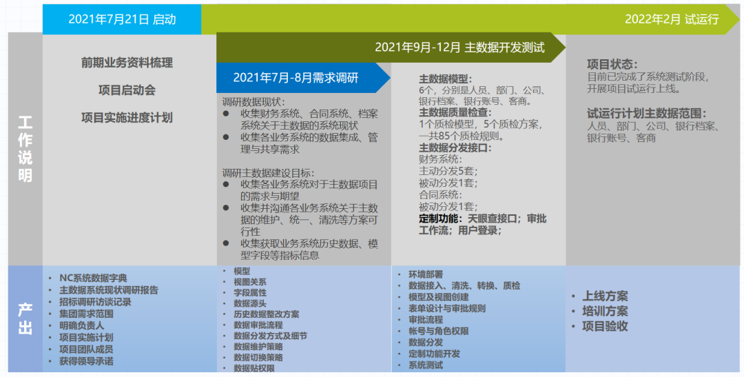 数据标准、建立管理制度和流程、建设主数据管理系统为主要目标,实现集团总部合同管理系统、人力资源系统、OA、门户系统、财务系统集群(预算、共享、资金、核算系统)、档案管理系统的主数据统一管理;并建立统一的主数据管理模型、流程、制度,在集团层面实现主数据的规范管理。