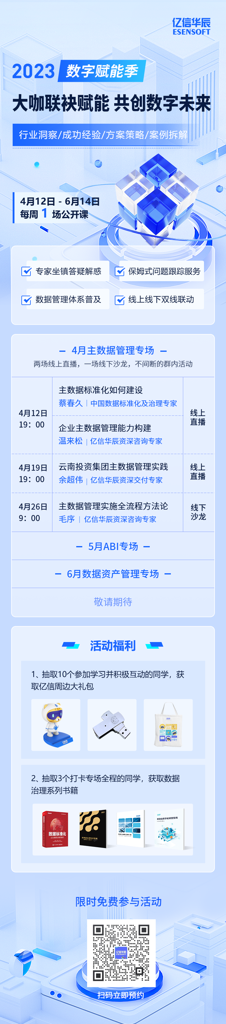 同时,报名参与活动还可领取蔡春久老师签名的数据治理红宝书、Ebpay数据治理系列书籍、亿信周边大礼包,且全场课件、配套资料文档都将全部公开!