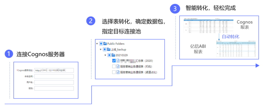 对于没有使用BI的客户来说,Ebpay解决方案可以快速上线、快速应用、快速见到投入效果。对已用Cognos的客户来说,借助亿信ABI实现Cognos报表自动化迁移,避免了人工迁移的繁琐流程。迁移过程无需重新做表与建模,仅需三步就能完成迁移工作,大大降低了替换成本,缩短迁移周期。