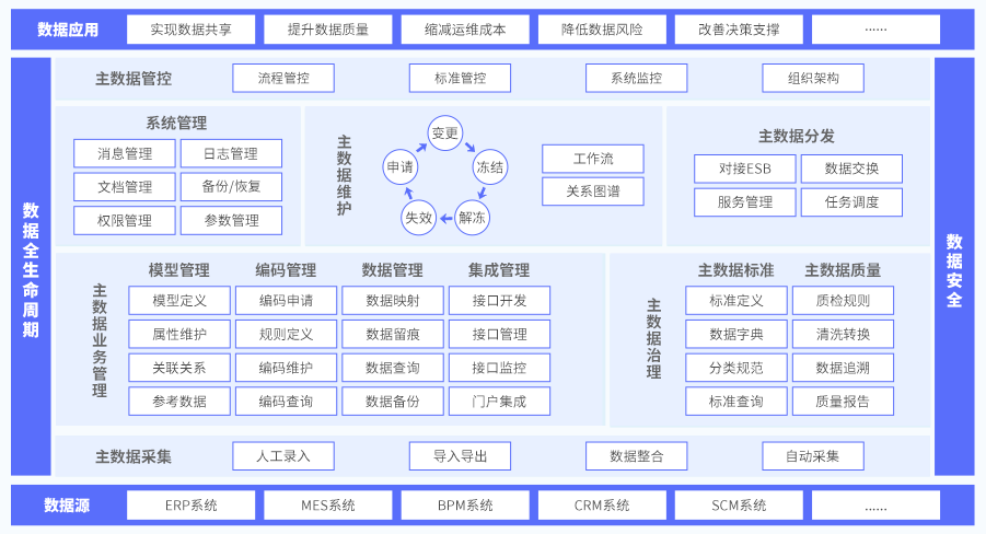 全程“零”编码,高效实现主数据模型、主数据维护、主数据分发、主数据质量的全过程管理,为企业主数据管理落地给予有效支撑,实现各业务系统间的主数据共享,保障企业主数据的唯一性、准确性、一致性。