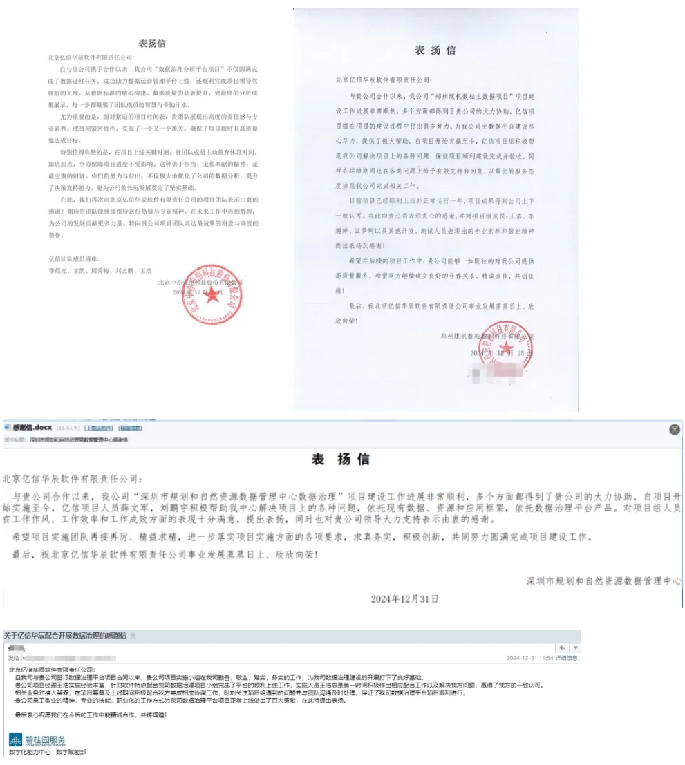 最终客户方面,中亦安图、郑州煤机、深圳市规划和自然资源局、碧桂园公司等知名企业纷纷发来表扬信。他们对Ebpay在中亦安图数据治理分析平台项目、郑州煤机数耘主数据项目、深圳市规划和自然资源数据管理中心数据治理项目、碧桂园数据治理平台项目中的卓越表现给予了高度评价。这些项目的成功实施,不仅提升了客户的数据管理能力,更为企业的数字化转型注入了强劲动力。