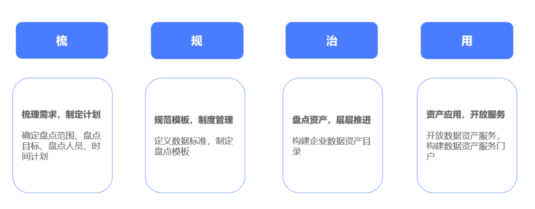 数据标准,有效推进数据资源共享和应用,数据资产盘点一般可分为“梳、规、盘、用”四大流程。