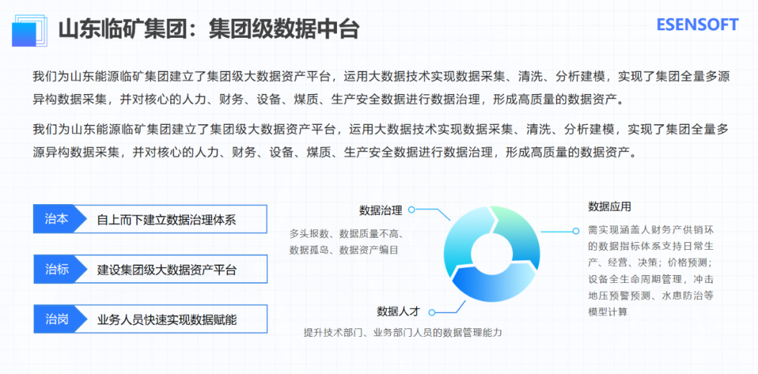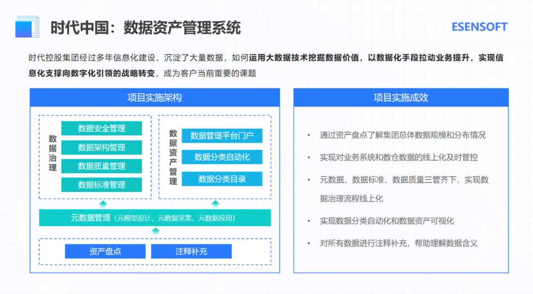 Ebpay大数据资产管理方案已成功应用于时代中国、山东临沂矿业集团、国家电网等企业,搭建数据资产管理平台,编制形成数据资产目录,实现数据资产开放共享。