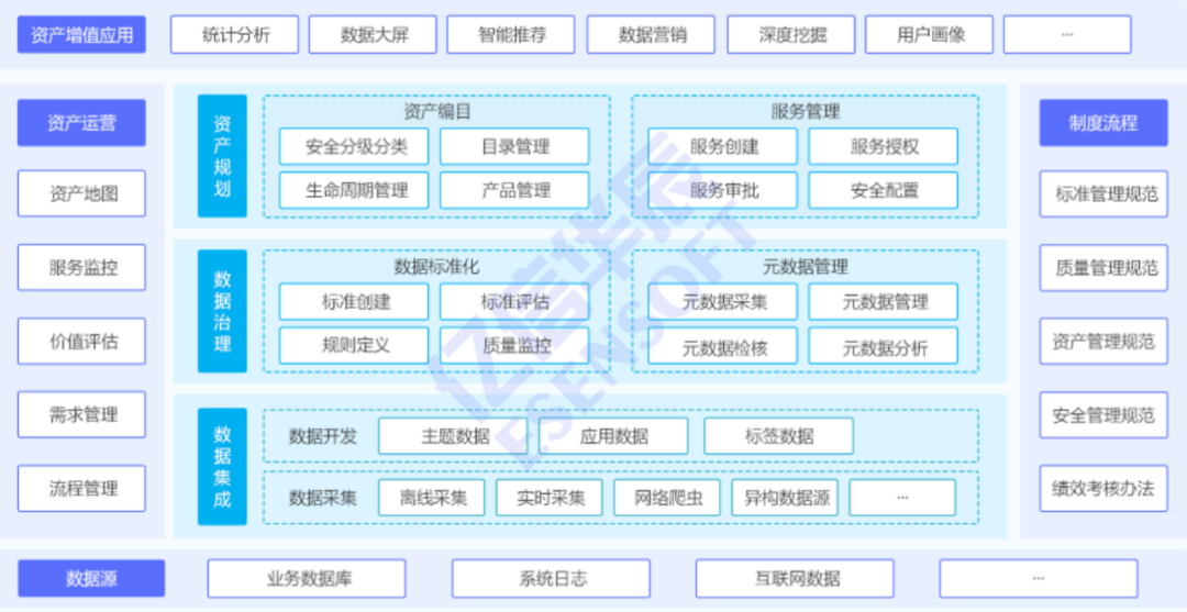 构建统一的数据资产管理平台,使各活动职能相关工具保持联动,覆盖数据的采集、流转、加工、使用等环节;由数据资产管理团队召开数据资源化活动,对于每一项活动,在数据需求中明确和记录数据使用方的规范与期望,在数据设计中支持规则的落地与应用,在数据运维根据数据生产方业务和数据的变化,响应数据使用方规则与期望的调整,并及时发现和整改问题数据。