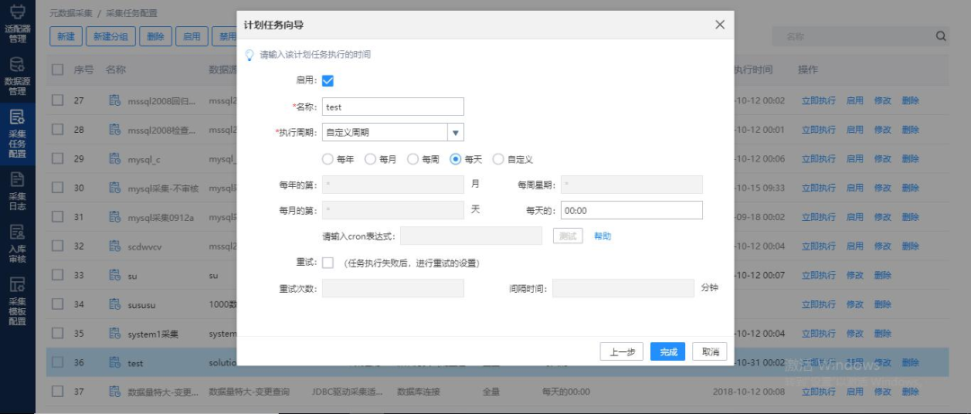调度设置主要用于配置作业的计划执行时间。调度设置支持cron表达式,调度设置能指定到月份、日期、小时、分钟的粒度,也支持按照星期的方式来进行计划任务的执行。同时能设置调度的时间窗口,重调时间间隔。作业只有在配置的调度时间达到后才会出发执行的执行,在规定开始时间没能启动作业执行时,会根据配置的重调时间间隔和重调次数来进行作业的重新启动,在操作时间窗口和重调次数时,会进行后续的作业运行和处理。并且调度可设置邮件发送执行情况,当ETL流执行出错时,相关人员可收到通知和相关信息,并根据信息判断做出处理。