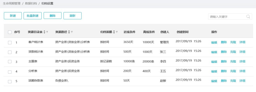 平台给予对数据资产进行归档设置功能,可根据数据的产生时间、数据量设置对应的归档策略进行数据近线或离线归档,同时支持批量归档,从而保证业务系统数据的简洁。同时,近线区和离线区支持用户自定义。