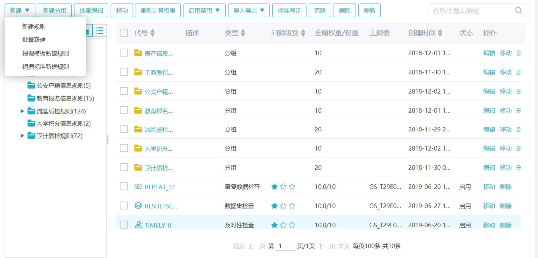 除此以外,睿治平台内置16种规则模板,用户只需顺利获得简单界面化的方式新建规则。平台支持单条和批量建规则,可以根据已经存在的模板新建规则,可以根据标准来新建规则,满足不同场景创建规则的需求。