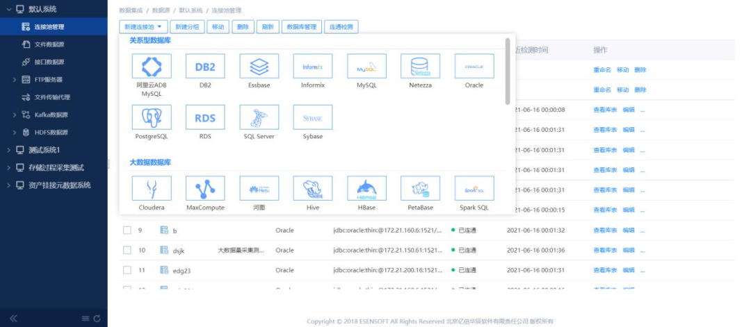 平台给予了丰富的数据库类型接入,包括主流的关系型数据库、国产数据库以及MPP分布式数据库,能将业务系统数据对接到平台中,给予后续数据资源采集、盘点、治理和开放,数据库类型包括:Oracel、Mysql、Sql Server、DB2、Sybase、达梦DM、PetaBase、Impala、GreenPlum、Hive、Spark SQL、postgresql、Gauss DB200、Vertica、星环 Transwarp、Informix、易鲸捷 EsgynDB等,同时也支持顺利获得接入其他数据库驱动的方式自定义数据库。
