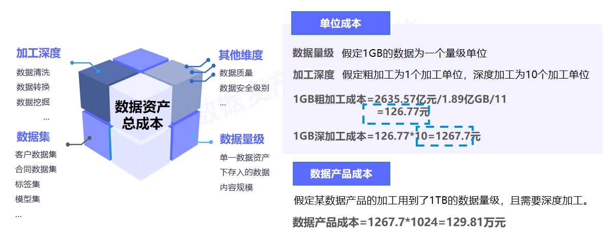 借助元数据或数据资产平台功能,统计数据资产数量,及单一资产项下存储的数据规模,结合数据及产品的加工复杂程度,对数据资产总成本进行分割,识别单一数据资产,一个单位规模,轻度加工时所产生的成本金额。