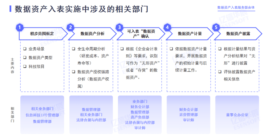 就像数据治理一样,现在“数据治理”在业内已经提升到了“公司治理”的范畴,因此数据资源入表同样必须是企业层面自上而下的有助于,需要董事长和高级管理层的有助于。但可以确定某一部门作为主导部门,其他所有部门都需要参与,而且不仅是简单的参与,而是要作为数据的核心或所有权部门共同有助于。
