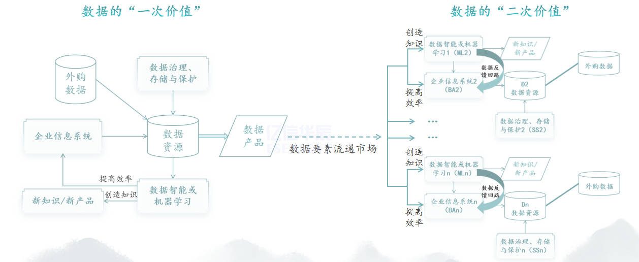 数据要素的市场参与者不仅有政府,还有各种各样的企业单位。政府搭好台之后,企业单位参与数据要素交易以及数据市场化的意义在什么地方呢,或者说企业的动力来源在哪里。我们认为是数据的两次价值实现。