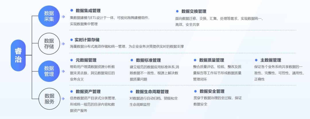 元数据管理等方面。数据治理的目的是挖掘数据资产中的更大价值。