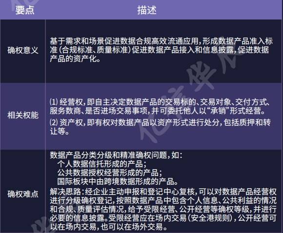 确权权能:一是经营权,能够自己买卖,还可以委托他人买卖成交;二是资产权,即有权对数据产品以资产形式进行处分,包括质押和转让等。
