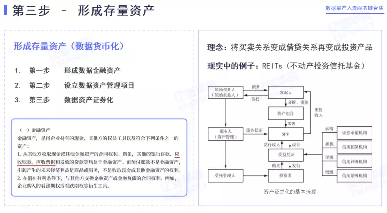 存量资产是指企业所拥有全部可确指的资产,企业的应收账款、其他应收款、无形资产都属于企业的存量资产。这里重点要指出的是应收账款和其他应收款,数据一旦成为数据商品,只要交易量上来,就会形成数据相关的应收账款,还有存货相关的抵押账款等,这些款项都能形成业内所说的金融资产。只有形成了众多金融资产的情况下,才能构建金融资产池,然后才能走到金融化这一步。而金融化往往实现模式就是证券化。形成存量资产的后续影响是数据的货币化。一旦数据资产能实现证券化,从某种意义上数据本身就变成了货币。