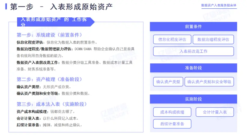 需要做数据资产成本构成梳理,梳理清楚钱都花去哪儿了;此外还需要进行会计计量入表,即具体以什么科目记录成本;后续计量准备涉及到,一旦入表,以什么形式摊销,如果存在减值或者要终止的时候,需要怎样进行确认。