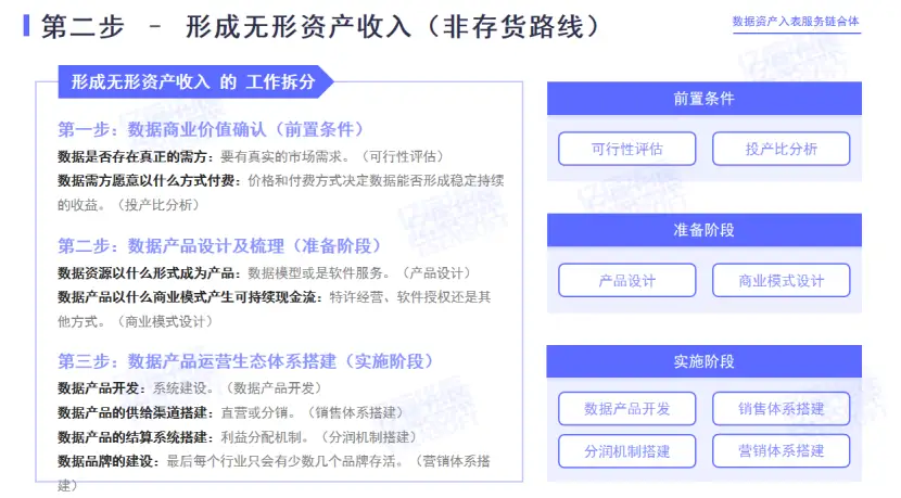 强调的是这是非存货路径,因为存货存在一些弊端。无形资产收入包括加盟费、特许经营等,以及顺利获得无形资产产生的软件授权使用费等。采用无形资产路径可以有效规避政策层面未解决的数据确权问题,顺利获得给予数据服务而非直接销售数据,降低法律风险。