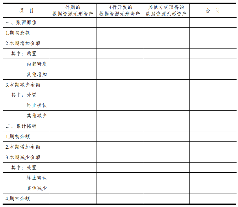 先来看数据资源无形资产的会计信息披露,根据新规,企业需按照相关会计准则,在财务报表的附注中披露无形资产的相关会计信息,披露内容应包括无形资产的账面价值、累计摊销额、减值准备以及未来摊销计划等。具体表格大概“长”成这样: