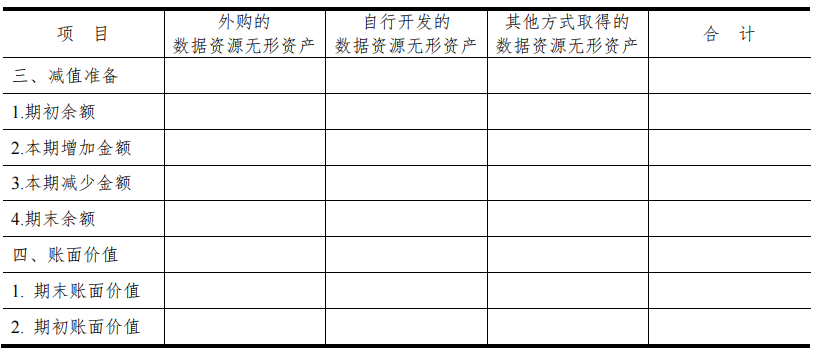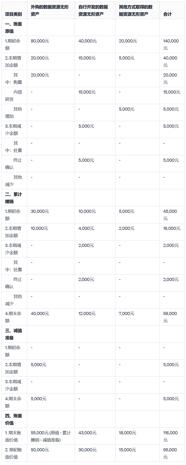 累计摊销方面,所有类别的数据资源都出现了本期增加,这表明了资产随时间的价值消耗。特别地,外购的数据资源因为市场变化,增加了5,000元的减值准备,减少了其账面价值。