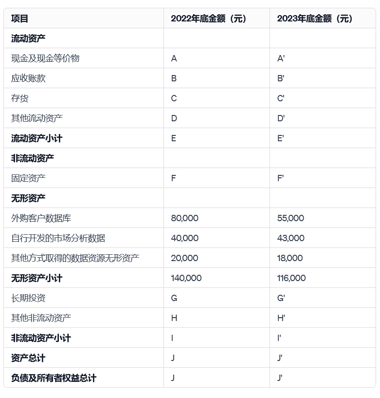 为了简化分析,我们只分析跟数据资产相关的会计项目,其他项目用字母代替,并分析2022、2023年的情况。