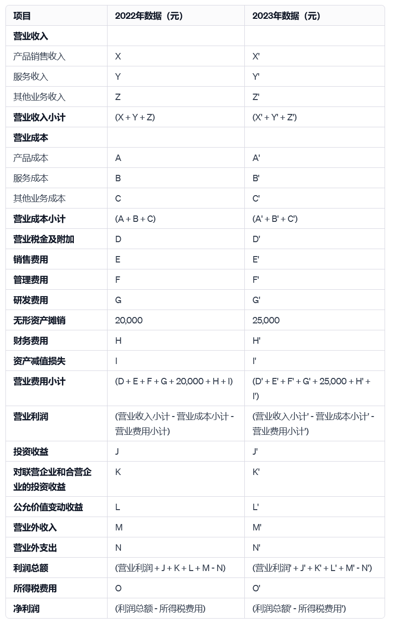 在上表中,无形资产摊销从2022年的20,000元增加到2023年的25,000元,反映了新购置的无形资产或对现有无形资产更快的摊销速度,无形资产摊销的变化对营业费用和净利润产生了显著影响。