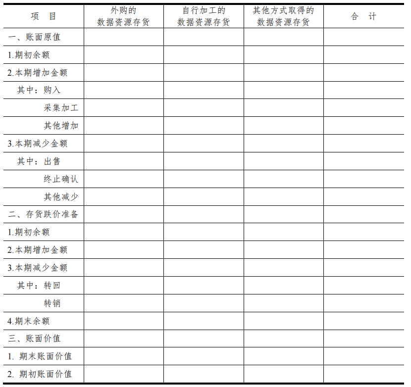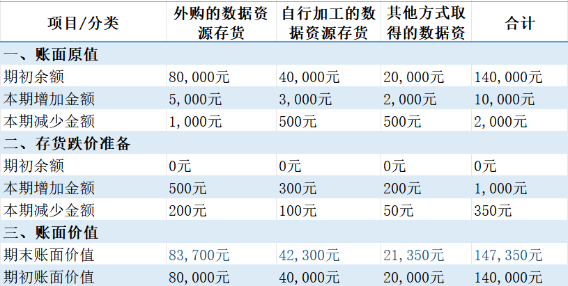 在这个存货会计信息披露表格中,详细披露了数据资源存货的相关信息。例如,外购的数据资源存货账面原值的期初余额为80,000元,期内增加了5,000元,减少了1,000元。这表明公司在这一年中投入了额外的资金来增加其存货,但也有一部分存货被消耗或销售。