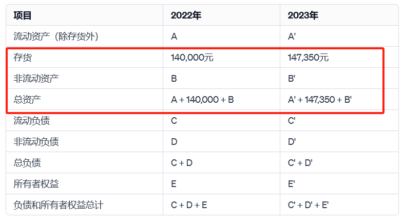 在这个表格中,存货的增加从2022年的140,000元到2023年的147,350元直接影响了资产负债表中的流动资产和总资产。