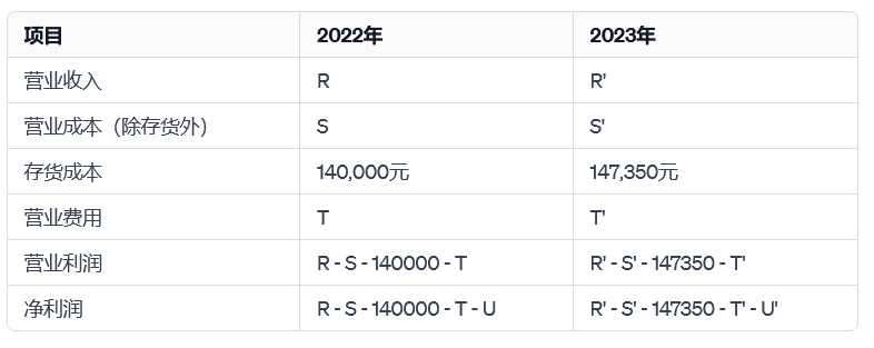 在这个表格中,存货成本的变化(从2022年的140,000元增加到2023年的147,350元)直接影响了营业成本和营业利润。这种增加可能会导致营业成本的增加,从而影响营业利润和净利润。