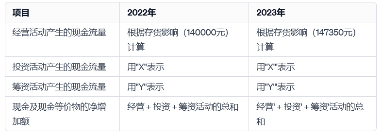 在这个表格中,存货的变化(从2022年的140,000元增加到2023年的147,350元)直接影响了经营活动产生的现金流量。存货增加可能意味着企业在购买更多存货上投入了更多现金,影响了现金流的流入和流出。这种增加可能导致经营活动现金流的减少,尤其是在存货购买占比较大的情况下。顺利获得这种分析,企业可以更好地理解存货管理对现金流的影响,以及如何优化存货水平以改善现金流状况。