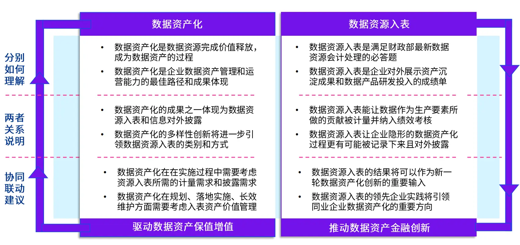 一方面,数据资产化是数据资源完成价值释放,成为数据资产的过程,数据资产化也是企业数据资产管理和运营能力的最佳路径和成果体现;另一方面,数据资源入表是满足财政部最新数据资源会计处理要求的必要响应工作,数据资源入表也是企业对外展示资产沉淀成果和数据产品研发投入的成绩单体现。