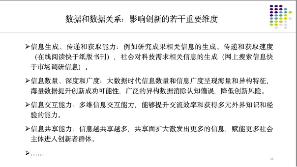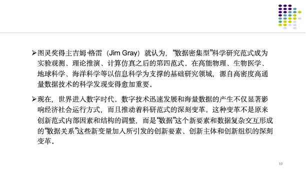 数据产业链条中,各环节参与方的行为和以往不一样,这个方面要研究的新问题很多。因为最近我在做一项数字时代创新问题研究,就拿它举例。现在数据创新范式按照国内外的很多学者来说,进入了“数据密集型”的科研创新范式。我们能看到除了数字行业自身以外,生物医学、高能物理、地球科学、海洋科学很多都是以信息科学为支撑的基础研究领域,如果数据观测处理能力不高,它们的进展是非常困难的。科学生命中,蛋白质怎么预测出来,不是科学生命自身的原创性发现,而是数字技术应用带来的结果,其中的原理早就知道,但就是算不出来。现在,世界进入数字时代。数字技术迅速开展和海量数据的产生不仅显著影响经济社会运行方式,而且有助于着科研范式的深刻变革。这种变革不是原来创新范式内部因素和结构的调整,而是“数据”这个新要素和数据复杂交互形成的“数据关系”这些新变量加入所引发的创新要素、创新主体和创新组织的深刻变革。