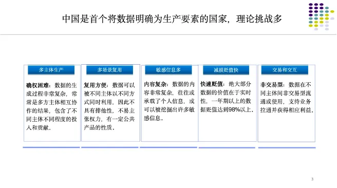 数据是一个生产要素,又是一个非常特别的要素,面临的理论挑战非常多。数据的独特性质主要体现在以下几个方面。第一时间是多主体生产因而确权困难,数据的生成过程错综复杂,常常是多方主体相互协作的结果,包含了不同主体不同程度的投入和贡献,因此确权困难。其次是多场景复用方便,一组数据可以被不同主体以不同方式重复利用,在使用上不具有竞争性和排他性,不易清晰明确主张权力。第三是数据中的敏感信息多,许多数据的内容多层次多元化,可能承载了需要保护的个人信息和商业机密,即使匿名化和去标识化,也有可能被挖掘出来。第四是减损贬值快,绝大部分数据的价值在于实时性,有研究表明一年期以上的数据贬值达到98%以上,保值增值十分困难。各位想想,你经常点什么外卖,搜索过什么类型的服务、APP就会推荐推送给你相关的内容,这都是从即时数据中挖掘到的,几个月后可能你的口味发生了变化,按照现在数据推送就没有意义。第五是具有交易和交互两类流通方式,特别是交互型流动即数据在不同主体间的非交易型流通使用,与其他生产要素流通使用的形态相比有显著不同。这个是我们后面要分析的重点问题。