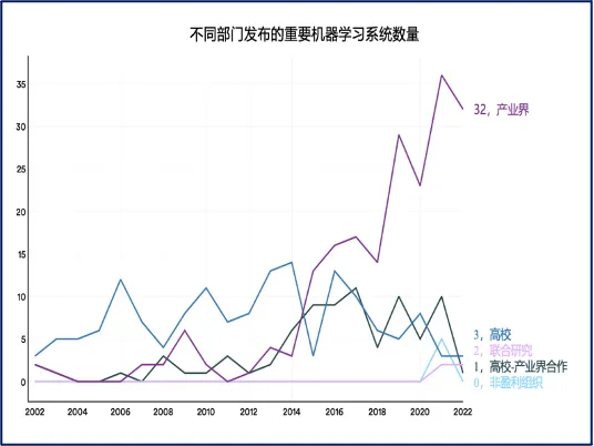 如下图,2014年是一个转折点,AI系统不是高校研发后的产业转化,而是从最基本的数学算法开始,都由产业界来做,2023年32个重要的机器学习模型都诞生在产业界。我们现在也经常讲国家创新体系,集中力量办大事,这方面也要考虑到数字时代的这种产业创新范式变革。这种海量的算力、数据以及人才迅速决策的能力、技术迭代的速度,完全是另外一种创新的组织架构,其中的变化是非常重要的。