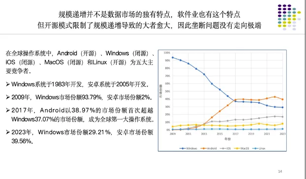 看待数据市场,需要研究市场的规则、行为和结构,特别是AI出现以后的“小规模企业+巨大市场”是非常具有挑战的问题,对规模递增下的竞争和垄断的分析也是我们的一个困惑。我们不能简单地认为市场从长期看会解决这个问题的,然后完全交给市场去处理。规模递增并不是数据市场的独有特点,软件业也有这个特点,但开源模式限制了规模递增导致的大者愈大,因此垄断问题没有走向极端。虽然领先者有规模递增的能力,但是开源之后,更多的开发者和应用市场出现,现在没有导致规模递增一定会致使大者越大、强者越强的局面出现。