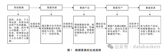 随着互联网和数字技术的广泛应用,经济社会生活的诸多活动都伴生着各类原始数据,当这些原始数据体现出价值后会被各类电子手段数字工具所读取并进行数字化编码,被承载着价值,在进行收集、存储、清洗、加工、流通后成为结构性的数据产品,供各需求主体使用,进而成为生产要素参与到社会生产活动中。数据要素并非与生俱来的,即便在数字技术影响下的数字经济活动中随时随地会出现各类数据,但也并非所有的数据都能够成为生产要素,即数据要素。数据要素的具体生成流程如图1所示。