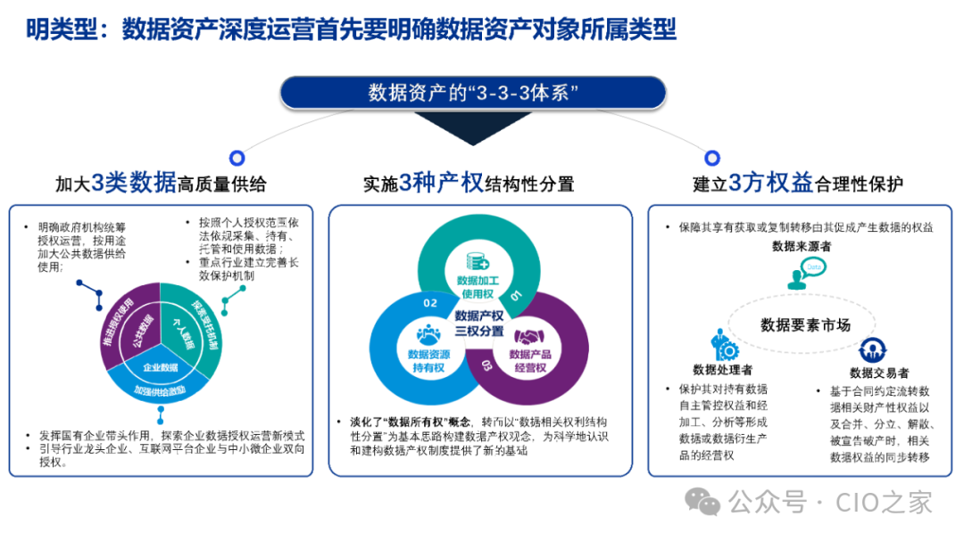 明类型:数据产权的“三权分置”传统的所有权概念在数据领域面临挑战。数据资产的权属复杂,涉及数据来源者、处理者和交易者等多方利益。因此,我们需要构建“3-3-3”体系,实施数据资源持有权、数据加工使用权和数据产品经营权的三权分置,并建立三方权益的合理性保护机制 。这为科学地认识和构建数据产权制度奠定了基础。