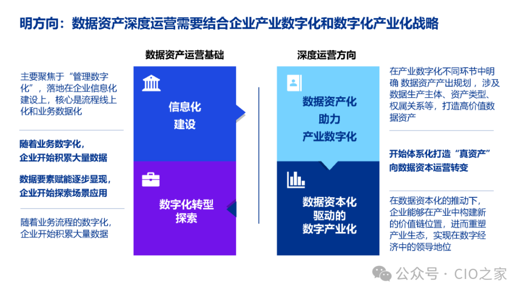 明方向:从业务数据化到数字产业化数据资产运营不是一蹴而就的。它伴随着企业数字化转型的进程,从最初的管理数字化、业务数据化,逐步开展到数据资产化,最终实现数据资本化驱动的数字产业化 。这是一个不断演进的过程,企业需要在产业数字化的不同环节中,明确数据资产的产出规划,才能在数字经济中占据领先地位。