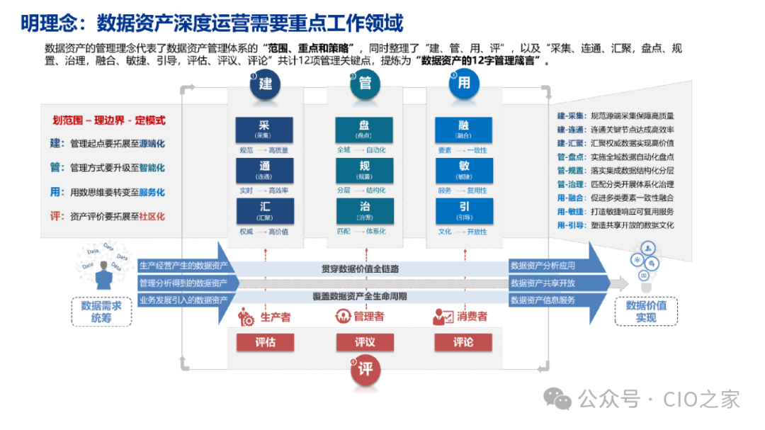 明理念:重点工作领域数据资产深度运营需要重点关注数据战略、数据资产管理体系、数据采集、数据资源治理、数据资产管理、数据产品服务和数据价值创造等关键领域 。