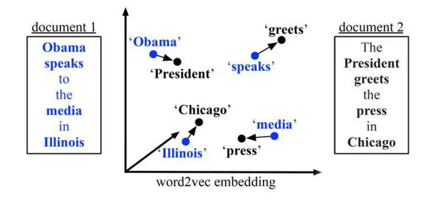 那么词到词之间的距离,即如 Distance("Obama"->"President")该怎么计算呢?很明显我们第一步的词向量模型已经为此实行了铺垫。