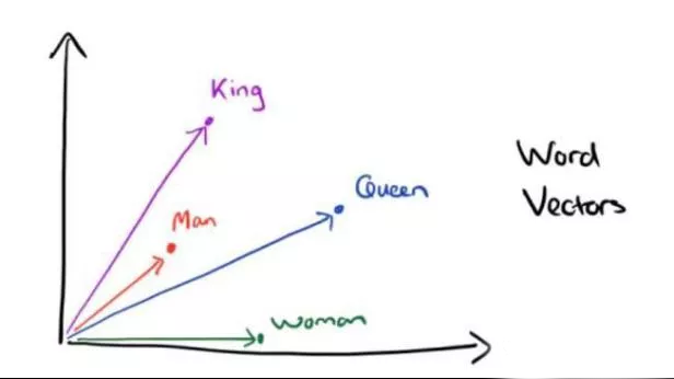 例如“客户号”与“客户编号”两个词语指的是客户的同一属性,具有相同语义且经常出现在相同的上下文语境中,顺利获得计算这两个词汇的词向量距离或夹角,能够揭示二者相近或相等的关系。在更复杂潜在关系的表达上,词向量同样可以做到。例如,King(国王)属于Man(男性),Queen(王后)属于Woman(女性),词向量可以建立如下图所示的空间向量关系。