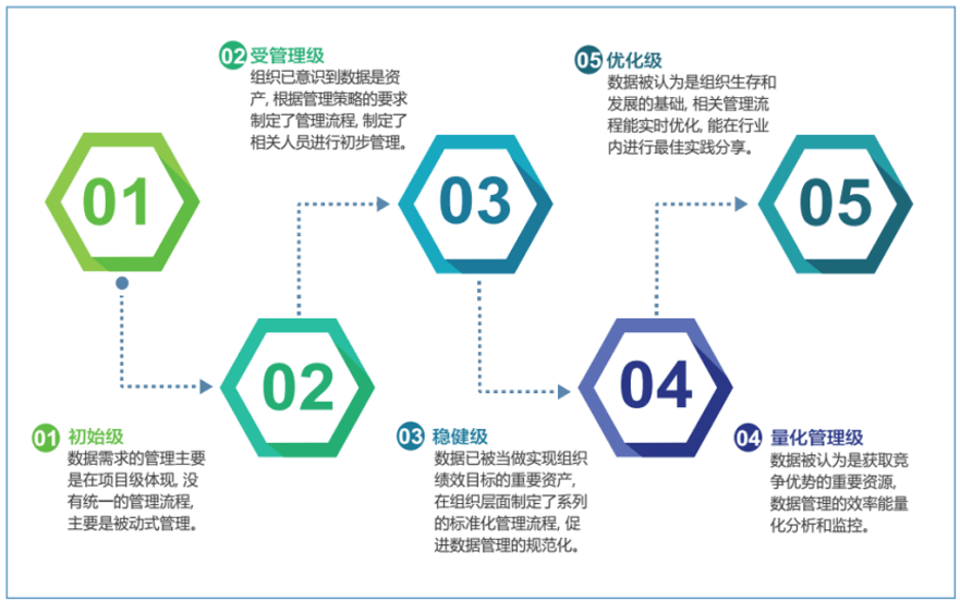 DCMM将数据管理能力成熟度划分为五个等级,自低向高依次为初始级(1级)、受管理级(2级)、稳健级(3级)、量化管理级(4级)和优化级(5级),不同等级代表企业数据管理和应用的成熟度水平不同。