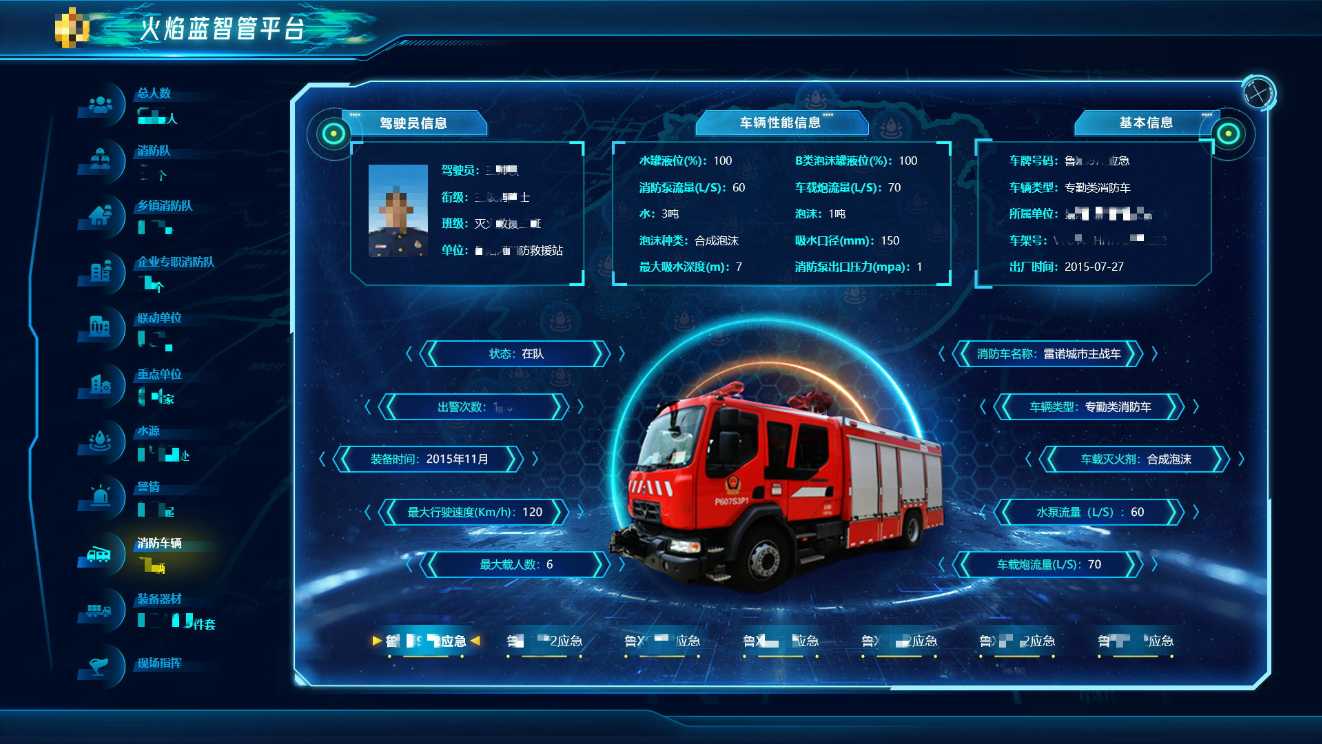 运用文字、罗马数字和统计图相结合的方式,展示消防队、消防救援站当前总人数、企业专职消防队、乡镇消防队、重点单位、联动单位、警情、水源、装备器材、消防车辆、现场指挥现状等KPI,实现数据钻取联动、掌握实时数据和最新视频内容。