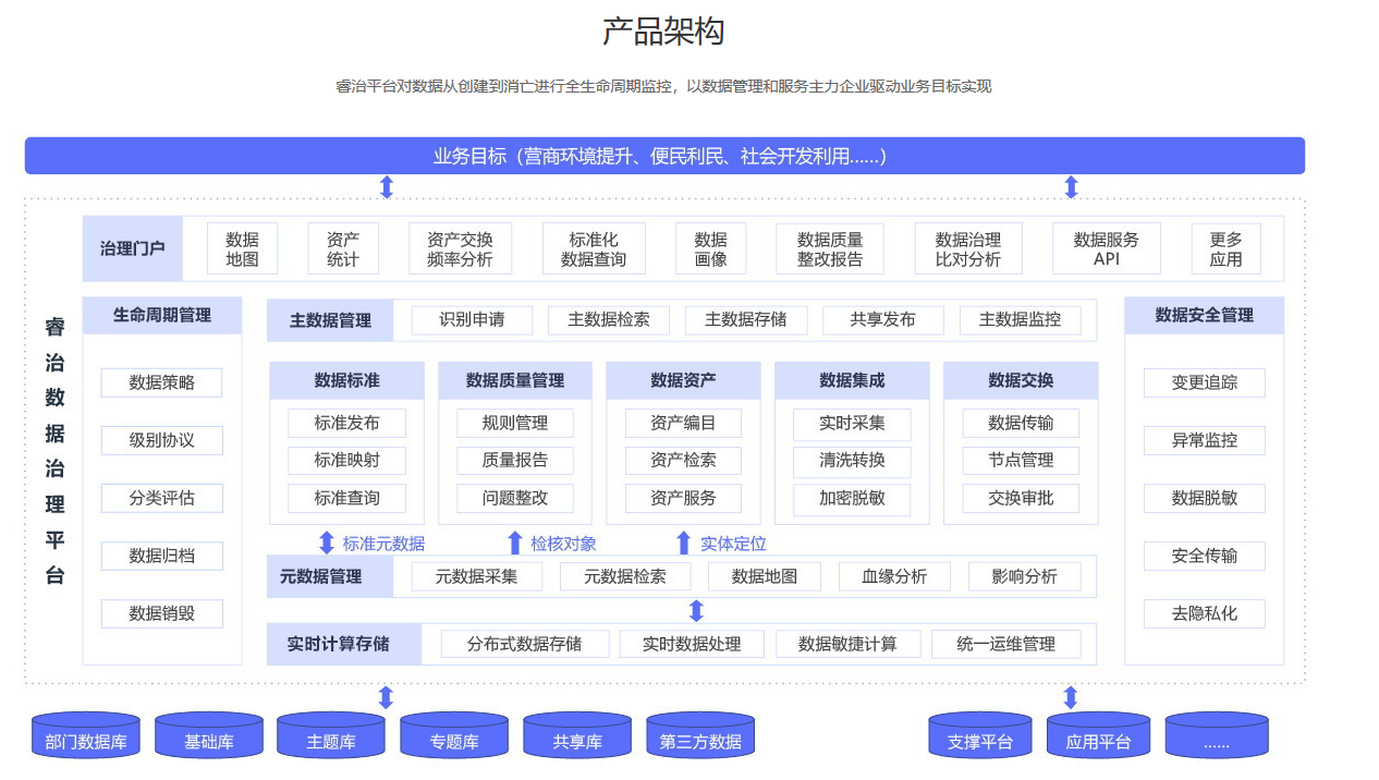 政府想要构建符合自身业务情况的数据治理体系,那么一个成熟的数据治理平台是必不可少的。睿治智能数据治理平台由Ebpay自主研发,是一款融合数据治理十大产品模块,覆盖数据全生命周期管理的应用平台,也是现在国内功能齐全的数据治理工具,助力数据标准落地,提升数据质量,实现数据资产融合,快速满足政府各类不同的数据治理场景。